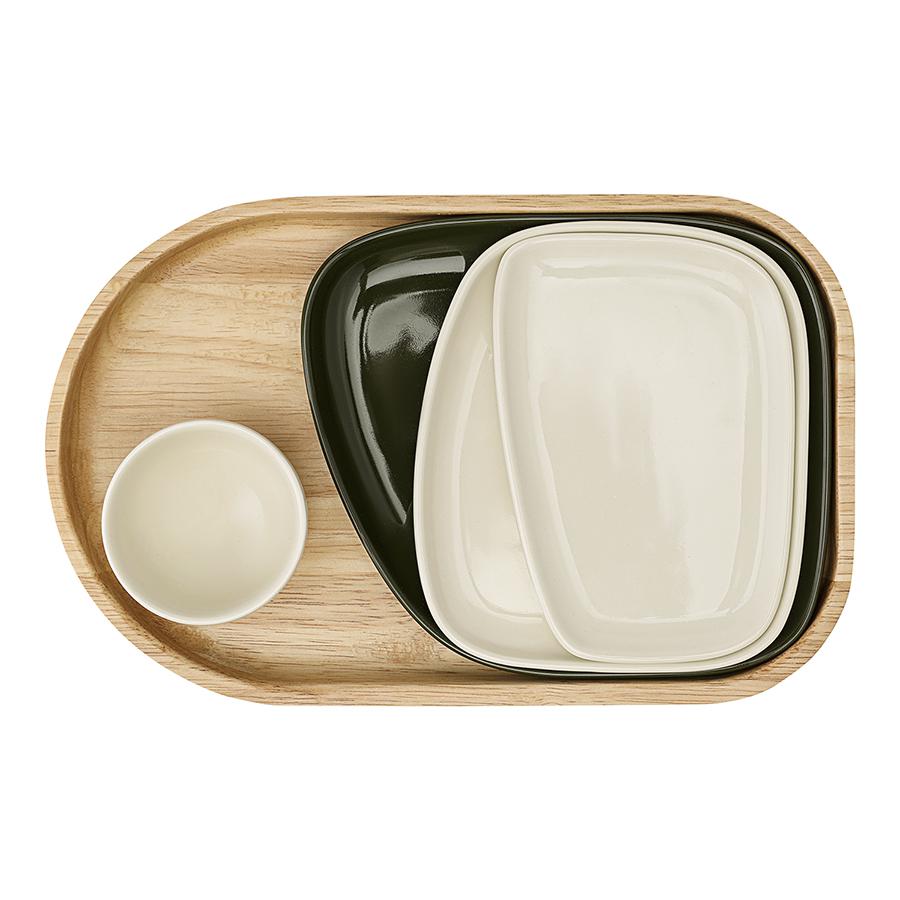 Набор сервировочный Sorrento объединяет элегантность фарфора и красоту натуральной древесины, превращая каждый прием пищи в торжество эстетики и вкуса. С его помощью вы сможете эффектно подать к столу различные закуски, соусы и разнообразить сервировку. Особенности и преимущества: - Посуда из фарфора имеет утонченный вид, подходит для микроволновой печи и посудомоечной машины, что делает ее удобной в использовании. - Набор включает тарелки разных форм и размеров, что позволяет удобно сервировать различные закуски. - Деревянный поднос имеет надежную цельную конструкцию с высокими бортиками, что предотвращает скольжение тарелок и продуктов. Материалы: тарелки – фарфор; поднос – каучуковое дерево. Размеры тарелок: 12,5х15х1,4 см; 14х12,3х1,1 см; 13,7х9х1 см. Размеры чаши: 6,4х5,8х3,8 см. Объем чаши: 44 мл. Размеры подноса: 25,8х16,5х2,5 см. Количество предметов в наборе: 5 шт. Тарелки можно мыть в посудомоечной машине и использовать в микроволновой печи. Поднос рекомендуется мыть вручную с помощью мягкой губки в теплой мыльной воде. После очищения аксессуар необходимо вытереть насухо полотенцем и поставить на хранение в хорошо проветриваемое место. Запрещается долгое замачивание, применение абразивных материалов, агрессивной бытовой химии и мытье в посудомоечной машине. Чтобы изделие из дерева дольше сохраняло привлекательный вид, 1-2 раза в месяц необходимо протирать его минеральным маслом. Состав нужно наносить на сухую поверхность и втирать до полного впитывания.