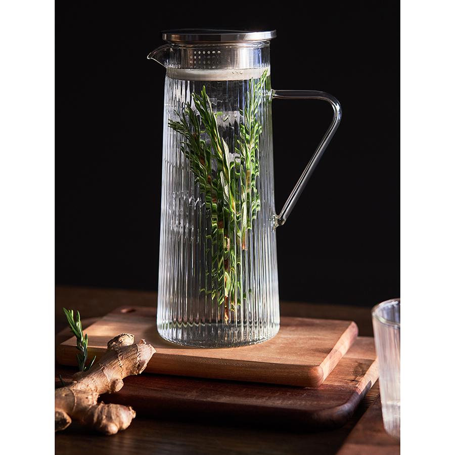Кувшин Soft Ripples не оставит равнодушными поклонников минимализма и качественной посуды. Вы можете подавать в нем лимонад, соки и другие освежающие напитки, а также использовать для чая – боросиликатное стекло не повреждается под воздействием высоких температур. Особенности и преимущества: - Боросиликатное стекло отличается высокой прочностью, устойчивостью к температурным перепадам, что делает посуду из него практичной и долговечной. - Крышка из нержавеющей стали имеет силиконовый уплотнитель, благодаря чему плотно прилегает. - Рельефный узор на внешней поверхности стенок выделяет посуду Soft Ripples на фоне других коллекций. Материалы: боросиликатное стекло, нержавеющая сталь, силикон. Высота: 24,7 см. Ширина с ручкой: 16 см. Диаметр низа: 10,1 см. Диаметр верха: 8,2 см. Объем: 1,2 л. Можно мыть в посудомоечной машине в деликатном режиме. Запрещается использование абразивных материалов и агрессивной бытовой химии.