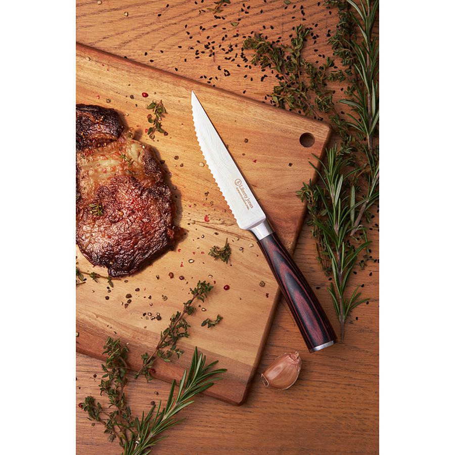 Набор ножей для стейка Butcher должен быть на кухне каждого ценителя мясных блюд. Эти кухонные инструменты сочетают в себе стильный дизайн, высокую практичность и просто созданы для тех, кто понимает, что идеальный стейк начинается с правильной нарезки. Особенности и преимущества: - Лезвия из углеродистой стали характеризуются прочностью, устойчивостью к высоким нагрузкам, не требуют частой заточки. - Рукоятки ножей изготовлены из композита Pakka wood, который получают путем смешивания и последующего прессования под высоким давлением слоев древесного шпона со смолами и красителями. Процесс стабилизации обеспечивает готовому материалу высокую прочность, водонепроницаемость, устойчивость к механическом повреждениям и температурным воздействиям. Материалы: углеродистая сталь, Pakka wood. Размеры: 2,2х28,6х2 см. Толщина лезвия: 0,2 мм. Длина клинков: 11,4 см. Угол заточки: 15-17°. Количество в наборе: 6 шт. Ножи рекомендуется мыть вручную. Запрещается использование абразивных материалов и агрессивной бытовой химии.