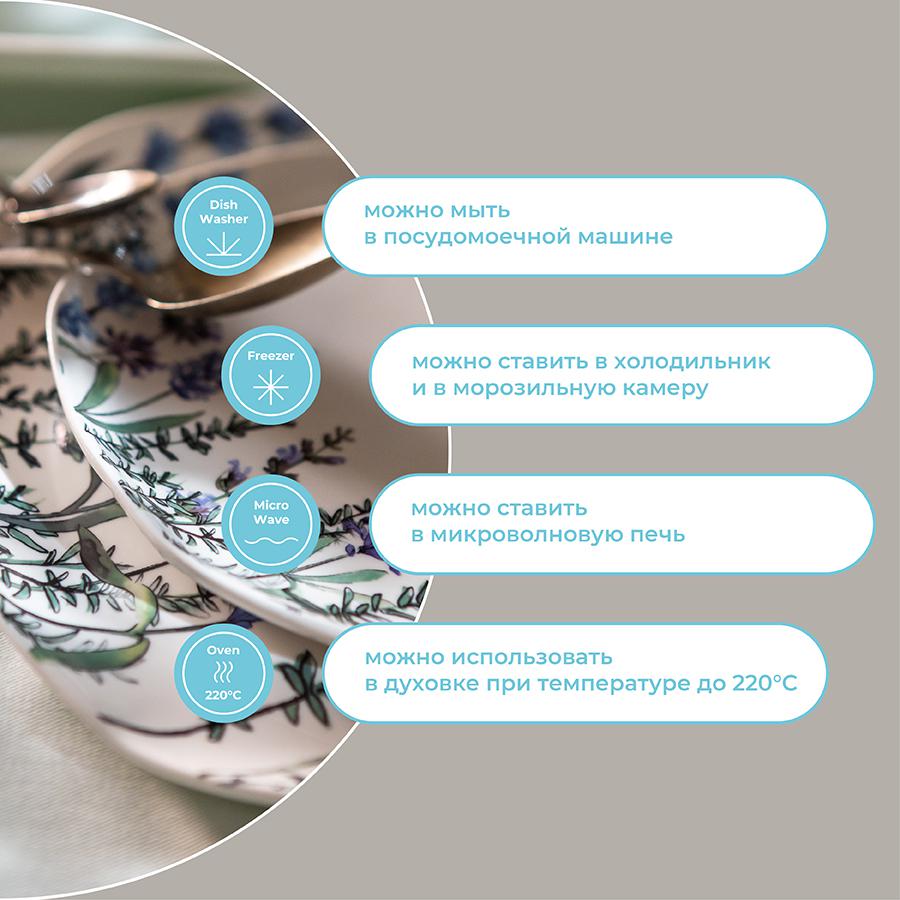 Тарелки для сервировки из фарфора Floral – прекрасный вариант для всех, кто ценит сочетание качества и эстетики. Цветущая лаванда, изображенная на белоснежной поверхности, превращает посуду в настоящее украшение стола. Материал изготовления неприхотлив в уходе, не впитывает загрязнения, является экологичным и безопасным для здоровья. Чистое сырье высочайшего качества и собственная формула глазуровки с обжигом при температуре 1250 °C делают изделия из фарфора особо прочными, устойчивыми к растрескиванию и появлению сколов. Глазурь и декор не тускнеют со временем, сохраняя первоначальный цвет и блеск. Наши продукты прошли испытания на отсутствие в составе свинца и кадмия в соответствии со стандартными тестами FDA. Материал: фарфор. Размеры: 19х19х1,5 см. Количество предметов в наборе: 2 шт. Можно мыть в посудомоечной машине, ставить в микроволновую печь, морозильную камеру, а также использовать в духовке при температуре не выше 180 °C.
