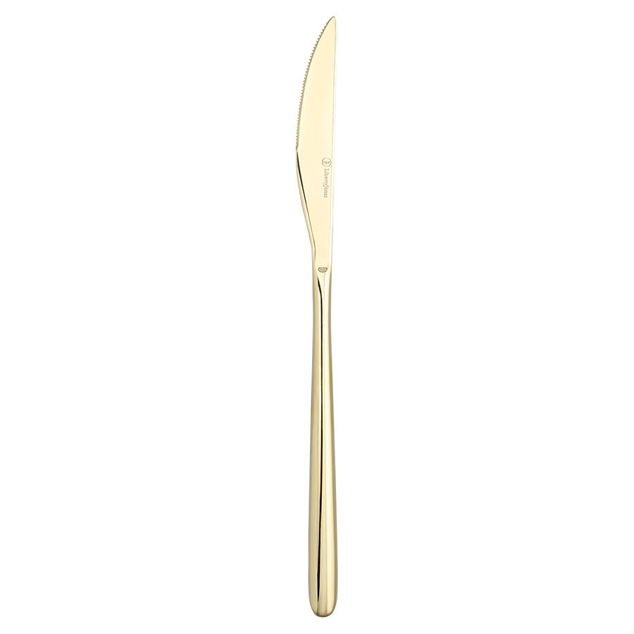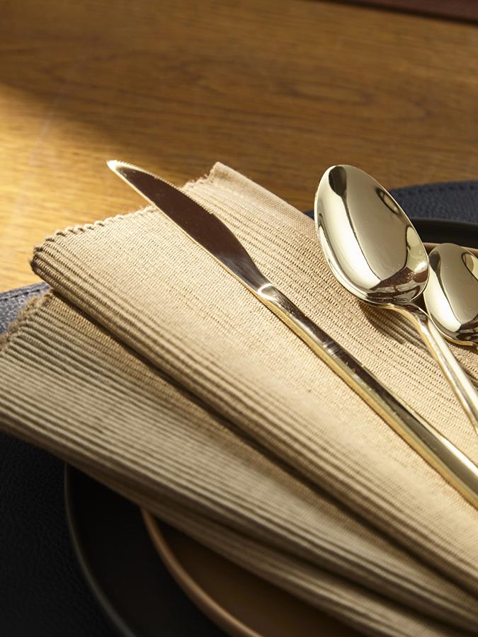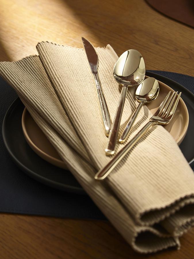 Набор столовых приборов Pure станет идеальным выбором для сервировки стола на любое мероприятие, будь то обычный семейный ужин или праздничный обед. Красивый блеск стали, плавные формы и деликатные изгибы каждого предмета создают гармоничное сочетание стиля и функциональности, позволяя наслаждаться каждым приемом пищи. Набор рассчитан на шестнадцать персон. Стандартный сет на одного человека включает в себя нож, вилку, столовую и чайную ложки. Особенности и преимущества: - Все предметы изготовлены из нержавеющей стали 18/0, которая отличается высокими антикоррозионными свойствами и износоустойчивостью. - Зеркальная полировка придает приборам красивый блеск, а также делает их поверхность более гладкой, обеспечивая долговечную эксплуатацию и простой уход. - Отличительная особенность коллекции – простые, элегантные формы, не перегруженные лишними деталями. - Столовые приборы золотистого цвета с зеркальной полировкой идеально вписываются в классическую и традиционную сервировку, прекрасно сочетаясь с белоснежной скатертью и фарфоровой посудой. В современных решениях они могут служить ярким акцентом на фоне простых и лаконичных элементов. Материалы: нержавеющая сталь 430 (18/0). Длина ножа: 23,5 см. Вес ножа: 68 г. Длина вилки: 21 см. Вес вилки: 54,5 г. Длина ложки: 21,5 см. Вес ложки: 65 г. Длина чайной ложки: 15 см. Вес чайной ложки: 24,5 г. Цвет: золотистый. Полировка: зеркальная. Количество предметов в наборе: 16 шт. Приборы рекомендуется мыть вручную.