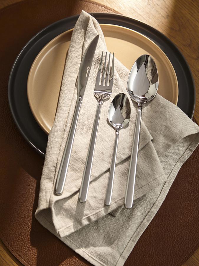 Набор столовых приборов Pure станет идеальным выбором для сервировки стола на любое мероприятие, будь то обычный семейный ужин или праздничный обед. Красивый блеск стали, плавные формы и деликатные изгибы каждого предмета создают гармоничное сочетание стиля и функциональности, позволяя наслаждаться каждым приемом пищи. Набор рассчитан на шестнадцать персон. Стандартный сет на одного человека включает в себя нож, вилку, столовую и чайную ложки. Особенности и преимущества: - Все предметы изготовлены из нержавеющей стали 18/0, которая отличается высокими антикоррозионными свойствами и износоустойчивостью. - Зеркальная полировка придает приборам красивый блеск, а также делает их поверхность более гладкой, обеспечивая долговечную эксплуатацию и простой уход. - Отличительная особенность коллекции – простые, элегантные формы, не перегруженные лишними деталями. - Столовые приборы серебристого цвета с зеркальной полировкой – прекрасное решение для сервировки в любом стиле. Они легко комбинируются с различными вариантами посуды и текстиля, что делает их универсальным выбором для любого мероприятия. Материалы: нержавеющая сталь 430 (18/0). Длина ножа: 23,5 см. Вес ножа: 68 г. Длина вилки: 21 см. Вес вилки: 54,5 г. Длина ложки: 21,5 см. Вес ложки: 65 г. Длина чайной ложки: 15 см. Вес чайной ложки: 24,5 г.. Цвет: серебристый. Полировка: зеркальная. Количество предметов в наборе: 16 шт. Приборы будут дольше сохранять привлекательный вид, если мыть их вручную. Допускается мытье в посудомоечной машине в низкотемпературном режиме с использованием деликатных моющих средств. Запрещается применение абразивов и агрессивной бытовой химии.